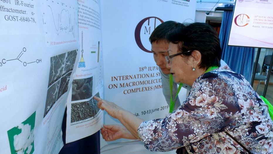 С 10 по 13 июня 2019 года директор ИПМТ, профессор Кудайбергенов С.Е., ГНС, профессор Сигитов В.Б. и к.х.н., Кудайбергенова Г.М. принимали участие в 18-м Международном симпозиуме IUPAC «Макромолекулярные металлокомплексы» (18-th IUPAC International Symposium on Macromolecular-Metal Complexes) — «MMC-18». Симпозиум проходил на комфортабельном теплоходе «Н.А. Некрасов» по маршруту Москва-Тверь-Мышкин-Углич-Москва. Организаторами мероприятия выступили Московский Государственный Университет имени М.В. Ломоносова при поддержке Международного союза теоретической и прикладной химии (ИЮПАК). В работе MMC-18 принимали участие более 80 ученых и специалистов со всего мира для обмена опытом и обсуждения теоретических и практических аспектов разработки и применения макромолекулярных металлокомплексов. Казахстан представляли ученые во главе с профессором Кудайбергеновым С. сотрудники АО «Институт топлива, катализа и электрохимии им. Д.В. Сокольского», КазНУ имени аль-Фараби и Восточно-Казахстанского государственного университета имени С.Аманжолова. Профессор Кудайбергенов С.Е., который является членом оргкомитета IUPAC International Symposium on Macromolecular-Metal Complexes) — «MMC-18», выступил с пленарным докладом на тему: «Macromolecular Complexes of Polyampholytes».